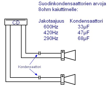 Alataajuuksien leikkaus tapahtuu yksinkertaisella ylipäästösuotimella, joka toteutetaan kytkemällä kaiuttimen kanssa sarjaan sopivan kokoinen Bipolaarinen elko tai muovikondensaattori, tästä muodostuu 6dB/oct ylipäästösuodin. Myös autosoittimen basso-säätö kannattaa pitää mahdollisimman pienellä. Allaolevasta kuvasta löytyy 8ohm kaiuttimelle laskettuja arvoja vakiokokoisille kondensaattoreille sekä kytkentäkaavio.